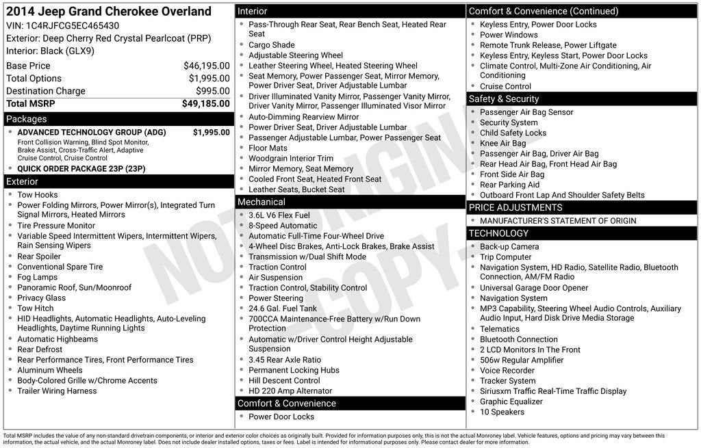 Deep Cherry Red Crystal Pearlcoat 2014 Jeep Grand Cherokee Overland 4WD 3.6L V6 Flex Fuel 24V VVT 8-Speed Automatic