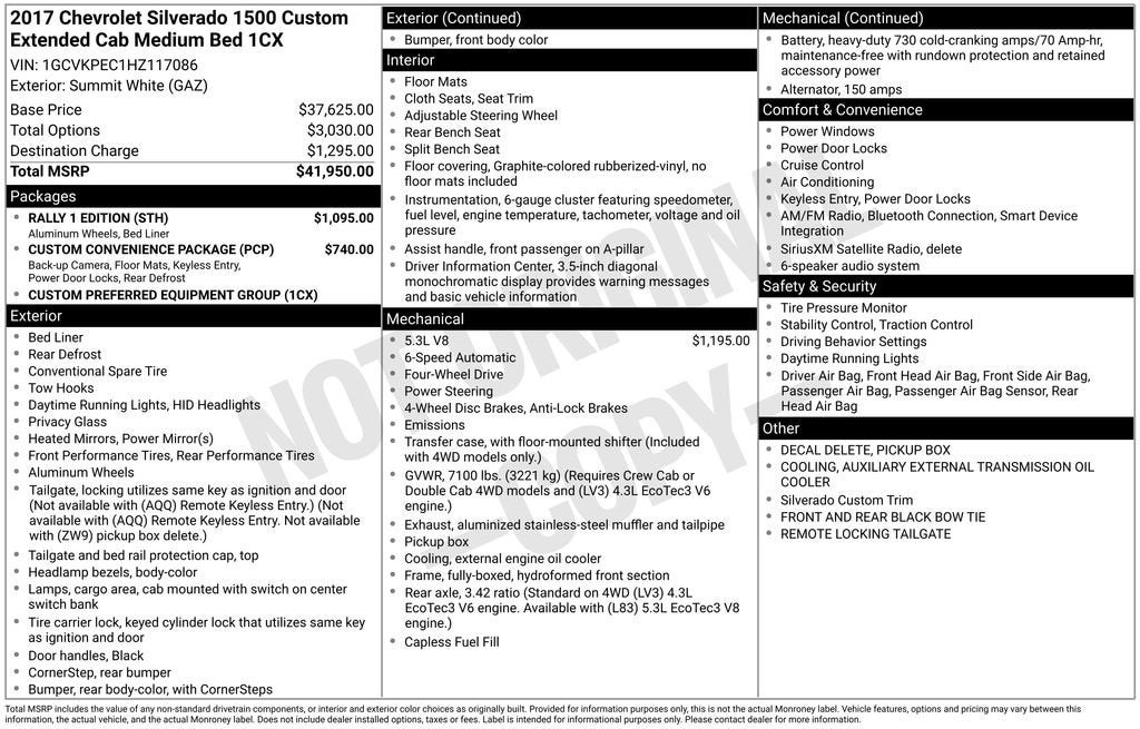 Your Premier Certified Pre-Owned Dealer in Chesterfield, MI – Where You Get the Best Price... PERIOD!Summit White 2017 Chevrolet Silverado 1500 Custom 4WD EcoTec3 5.3L V8 6-Speed Automatic Electronic with OverdriveClean CARFAX. Odometer is 22795 miles below market average! Priced below KBB Fair Purchase Price!3-Passenger Full-Width Folding Rear Bench Seat, 40/20/40 Front Split Bench Seat, 6 Speaker Audio System, Apple CarPlay/Android Auto, Auxiliary External Transmission Oil Cooler, Bluetooth® For Phone, Custom Convenience Package, Deep-Tinted Glass, Driver Information Center, Electric Rear-Window Defogger, Front & Rear Black Bow Tie, Front Frame-Mounted Black Recovery Hooks, Fully automatic headlights, Heated door mirrors, Heavy Duty Suspension, High-Intensity Discharge Headlights, Illuminated entry, Preferred Equipment Group 1CX, Premium audio system: Chevrolet MyLink, Radio: AM/FM w/7 Diagonal Color Touch Screen, Rally 1 Edition, Rear Vision Camera, Remote Keyless Entry, Remote Locking Tailgate, Spray-On Pickup Box Bed Liner, Wheels: 20 x 9 Black-Painted Aluminum.Moran Certified Pre-Owned 586-434-0920 - 29425 23 Mile Rd. Chesterfield MI, 48047.