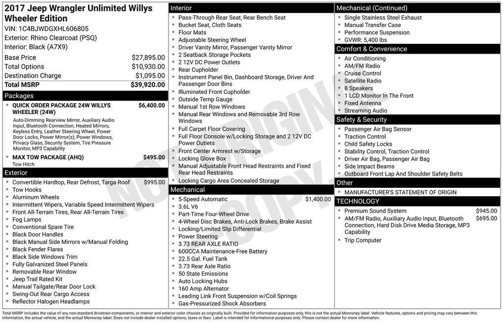 Recent Arrival! Clean CARFAX.Rhino Clearcoat 2017 Jeep Wrangler Unlimited Willys 4WD 3.6L V6 24V VVT 5-Speed Automatic