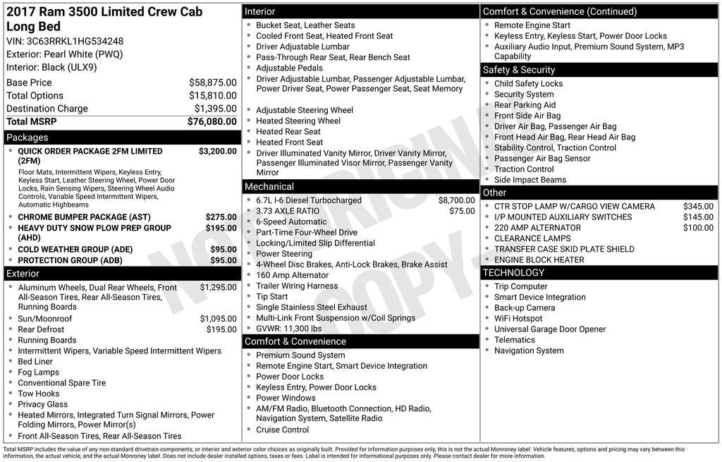Your Premier Certified Pre-Owned Dealer in Chesterfield, MI – Where You Get the Best Price... PERIOD!Pearl White 2017 Ram 3500 Limited 4WD Cummins 6.7L I6 Turbodiesel 6-Speed AutomaticOdometer is 23986 miles below market average! Priced below KBB Fair Purchase Price!10 Speakers, 115V Auxiliary Power Outlet, 220 Amp Alternator, 3.73 Axle Ratio, 6000# Front Axle w/Hub Ext, Adjustable pedals, AM/FM radio: SiriusXM, Auto High Beam Headlamp Control, Automatic temperature control, Box & Rear Fender Clearance Lamps, Center Hub, Chrome Bumper Package, Chrome Tubular Side Steps, Cold Weather Group, Dual Rear Wheel Fender Flare Tracking, Dual Rear Wheels, Electronically Controlled Throttle, Emergency communication system, Engine Block Heater, Folding Flat Load Floor Storage, Front dual zone A/C, Front fog lights, Fully automatic headlights, Garage door transmitter, Genuine wood dashboard insert, Heated door mirrors, Heated Front Seats, Heated rear seats, Heated Second Row Seats, Heated Steering Wheel, Heavy Duty Snow Plow Prep Group, High Back Seats, I/P Mounted Auxiliary Switches, Keyless Enter-N-Go, Laramie Limited Leather Bucket Seats, Leather steering wheel, Leather Wrapped Grab Handle, Limited Chrome Bodyside Molding, Limited Decor Group, Luxury Door Trim Panel, Luxury Front & Rear Floor Mats, Memory seat, Navigation System, ParkView Rear Back-Up Camera, Pedal memory, Power 10-Way Memory Driver & 6-Way Passenger Seats, Power Sunroof, Premium Filigree Leather Seats, Protection Group, Quick Order Package 26M Limited, Quick Order Package 2FM Limited, Radio: Uconnect 3C NAV w/8.4 Display, Rain Sensitive Windshield Wipers, Rear 60/40 Split Folding Seat, Remote keyless entry, Remote Proximity Keyless Entry, Security system, Ventilated Front Seats, Wheel to Wheel Side Steps, Wheels: 20 x 8.0 Satin Carbon w/Chrome Insert, Wood/Leather Wrapped Steering Wheel.Moran Certified Pre-Owned 586-434-0920 - 29425 23 Mile Rd. Chesterfield MI, 48047.