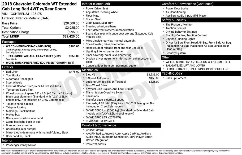 AS-IS VEHICLE DISCLAIMER: This vehicle is being sold AS-IS, with no warranty—express or implied. The vehicle may have mechanical, cosmetic, and / or body defects that may require repair. Moran assumes NO responsibility for the condition or performance of this vehicle after purchase. These vehicles are offered at a discounted price prior to being sent to auction, giving buyers an opportunity to purchase below market value. Buyers are encouraged to inspect the vehicle thoroughly or have it inspected by a qualified mechanic before purchase. ALL SALES ARE FINAL, and the buyer accepts the vehicle in its current condition.Silver Ice Metallic 2018 Chevrolet Colorado Work Truck 4WD V6 8-Speed AutomaticClean CARFAX.AS IS, 6-Speaker Audio System Feature, Apple CarPlay/Android Auto, Automatic Locking Rear Differential, Black Spray-On Bedliner w/Chevrolet Logo, Electronic Automatic Cruise Control, Extended Range Remote Keyless Entry, Exterior Parking Camera Rear, EZ-Lift & Lower Tailgate, Fully automatic headlights, Heavy-Duty Trailering Package, Preferred Equipment Group 4WT, Radio: AM/FM w/7 Diagonal Color Touch Screen, Tow/Haul Mode, Unauthorized Entry Theft-Deterrent System, Wheels: 16 x 7 Ultra Silver Metallic Steel, WT Convenience Package.Moran Certified Pre-Owned 586-434-0920 - 29425 23 Mile Rd. Chesterfield MI, 48047.