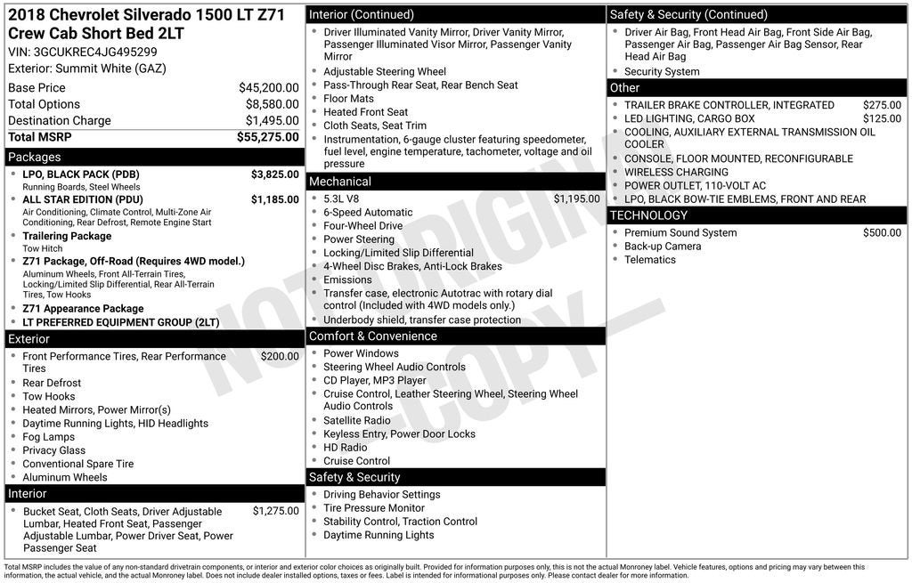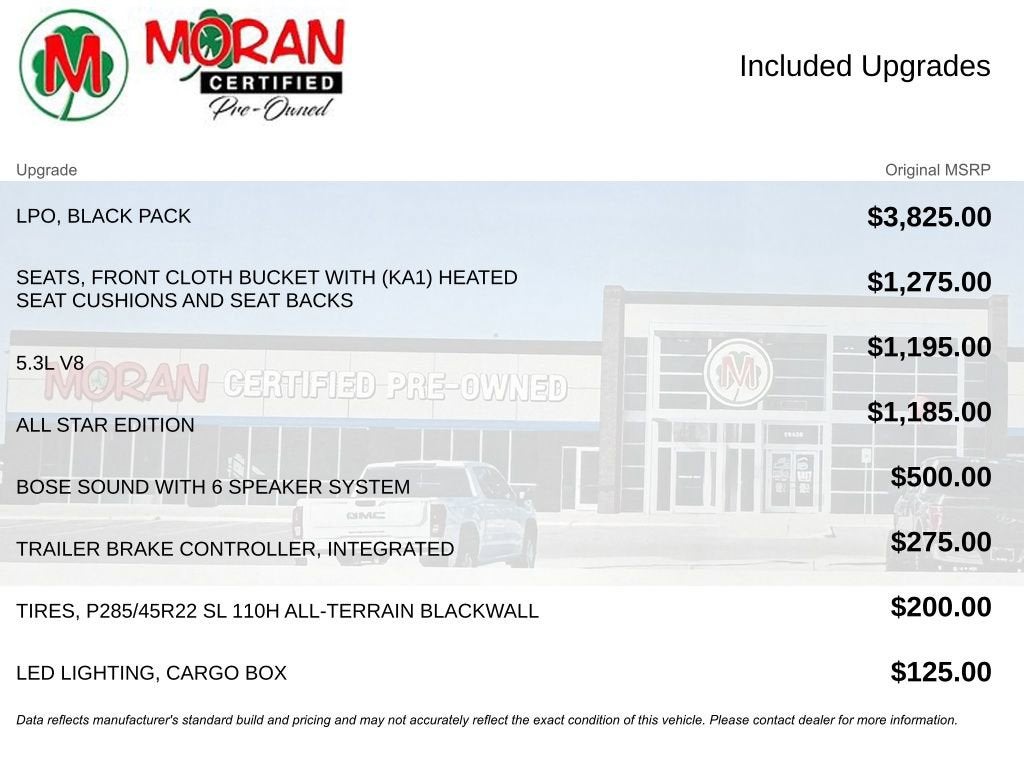 10-Way Power Driver's Seat Adjuster, 110-Volt AC Power Outlet, 4.2 Diagonal Color Display Driver Info Center, 4 Black Round Assist Steps (LPO), 40/20/40 Front Split Bench Seat, All Star Edition, AM/FM radio: SiriusXM, Auxiliary External Transmission Oil Cooler, Black Pack (LPO), Bluetooth® For Phone, Body Color Rear Bumper w/Cornersteps, Bose Speaker System, Chevrolet Connected Access, Chevrolet w/4G LTE, Deep-Tinted Glass, Driver & Front Passenger Illuminated Vanity Mirrors, Dual-Zone Automatic Climate Control, Electric Rear-Window Defogger, Exterior Parking Camera Rear, EZ Lift & Lower Tailgate, Front & Rear Black Bowtie Emblems (LPO), Front Body-Color Bumper, Front fog lights, Front Frame-Mounted Black Recovery Hooks, Fully automatic headlights, HD Radio, Heated Driver & Front Passenger Seats, Heavy-Duty Rear Locking Differential, Hill Descent Control, Integrated Trailer Brake Controller, Leather Wrapped Steering Wheel w/Cruise Controls, Off-Road Suspension Package, OnStar & Chevrolet Connected Services Capable, Preferred Equipment Group 2LT, Rear 60/40 Folding Bench Seat (Folds Up), Rear Wheelhouse Liners, Remote Keyless Entry, Remote Locking Tailgate, Remote Vehicle Starter System, Single Slot CD/MP3 Player, Steering Wheel Audio Controls, Theft Deterrent System (Unauthorized Entry), Thin Profile LED Fog Lamps, Trailering Package, Wheels: 22 5-Spoke High Gloss Black (LPO), Wheels: 22 x 9 Steel Interim (LPO).