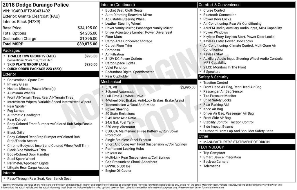 Your Premier Certified Pre-Owned Dealer in Chesterfield, MI – Where You Get the Best Price... PERIOD!Recent Arrival!Granite Metallic Clearcoat 2018 Dodge Durango Police AWD HEMI 5.7L V8 Multi Displacement VVT 8-Speed Automatic7 & 4 Pin Wiring Harness, Apple CarPlay/Android Auto, Class IV Receiver Hitch, Cloth Low-Back Bucket Seats, Emergency communication system: Roadside Assistance/9-1-1 Call, Engine Oil Cooler, Front Center Armrest w/Storage, Front dual zone A/C, Front fog lights, Fuel Tank Skid Plate Shield, Fully automatic headlights, Leather steering wheel, ParkView Rear Back-Up Camera, Quick Order Package 22X, Radio: Uconnect 4 w/7 Display, Remote keyless entry, Skid Plate Group, Trailer Tow Group IV, Wheels: 18 x 8.0 Painted Aluminum.Moran Certified Pre-Owned 586-434-0920 - 29425 23 Mile Rd. Chesterfield MI, 48047.