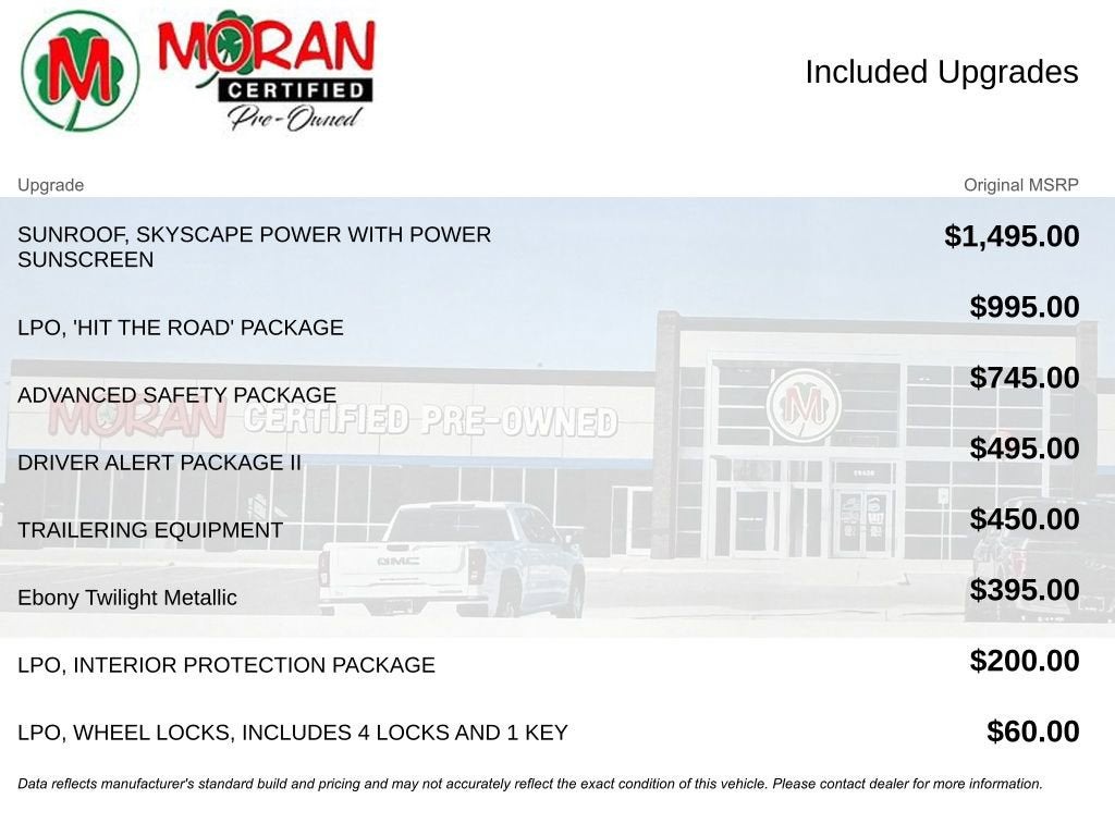2 USB Data Ports w/Auxiliary Input Jack, 6-Way Power Front Passenger Seat, 8-Way Power Driver Seat Adjuster, Advanced Safety Package, AM/FM radio: SiriusXM, Apple CarPlay/Android Auto, Automatic Parking Assist, Automatic temperature control, Bird's Eye View Surround Vision, Bluetooth® For Phone, Driver Alert Package II, Emergency communication system: OnStar Guidance, Exterior Parking Camera Rear, Factory Installed Trailer Hitch, Following Distance Indicator, Forward Collision Alert, Front dual zone A/C, Front fog lights, Fully automatic headlights, Garage door transmitter, HD Radio, Heated front seats, Heated steering wheel, Hit The Road Package, IntelliBeam Auto High Beam Headlamp Control, Interior Protection Package (LPO), Lane Keep Assist w/Lane Departure Warning, Low Speed Forward Automatic Braking, Memory seat, Molded Assist Steps, Navigation System, Perforated Leather-Appointed Seat Trim w/Denali Logo, Power Liftgate, Preferred Equipment Group 5SA, Premium 7-Speaker Bose Sound System w/Amplifier, Radio: GMC Infotainment System w/Navigation, Roof Rack Cross Rails (LPO), SD Card Reader, Security system, Skyscape Power Sunroof w/Power Sunscreen, Split folding rear seat, Trailering Equipment, Wheels: 19 x 7.5 Ultra-Bright Machined Aluminum.