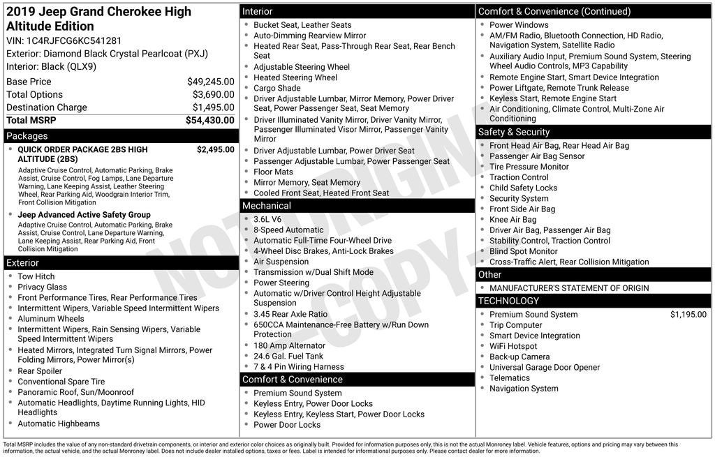 Diamond Black Crystal Pearlcoat 2019 Jeep Grand Cherokee High Altitude 4WD 3.6L V6 24V VVT 8-Speed Automatic