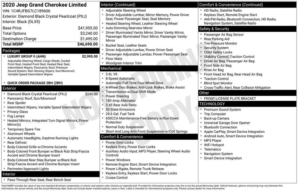 Diamond Black Crystal Pearlcoat 2020 Jeep Grand Cherokee Limited 4WD 3.6L V6 24V VVT 8-Speed Automatic