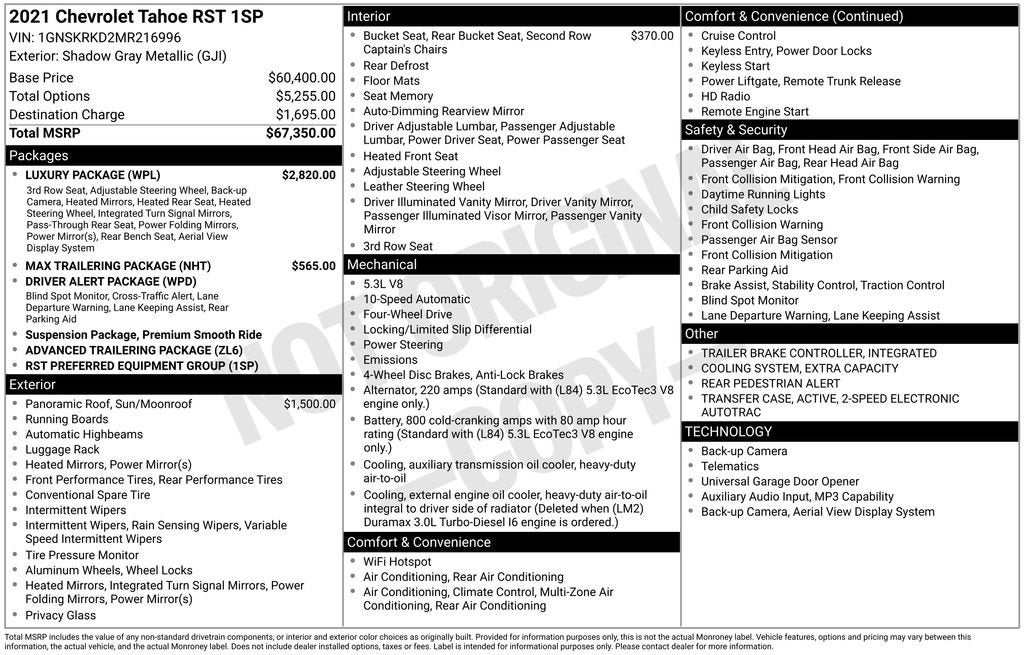 Your Award-Winning Chevrolet Dealer in Clinton Township, MI – Where You Get the Best Price... Period!Certified. Recent Arrival! Odometer is 22943 miles below market average!Certification Program Details: After passing our multi-point inspection, every CarBravo-Certified vehicle will receive a 12-month/12,000-mile (whichever comes first) limited bumper-to-bumper warranty - so you can feel confident and protected in your purchase! If the vehicle has bumper-to-bumper coverage remaining under the GM New Vehicle Limited Warranty, then the CarBravo limited bumper-to-bumper warranty coverage will go into effective upon expiration of the original New Vehicle Limited Warranty. If the vehicle's bumper-to-bumper coverage under the GM New Vehicle Limited Warranty has already expired by time or mileage as of the date of the CarBravo transaction, then the CarBravo limited bumper-to-bumper warranty becomes effective on the contract date of the CarBravo sale.Shadow Gray Metallic 2021 Chevrolet Tahoe RST 4WD EcoTec3 5.3L V8 10-Speed Automatic with Overdrive4WD, Jet Black/Victory Red Leather, 1st & 2nd Row Color-Keyed Carpeted Floor Mats, 2 USB Data Ports, 2-Speed Active Electronic AutoTrac Transfer Case, 2nd Row Pwr Release 60/40 Split-Folding Bench Seat, 3rd Row 60/40 Power-Folding Split-Bench Seat, Advanced Trailering Package, Advanced Trailering System, Auto-Dimming Inside Rear-View Mirror, Automatic Heated Steering Wheel, Bose 9-Speaker Stereo Audio System Feature, Bright Front & Rear Door Sill Plates, Color-Keyed Carpeting Floor Covering, Driver & Front Outboard Passenger Airbags, Driver Alert Package, Extra Capacity Cooling System, Floor Console w/Storage Area, Front & Rear Park Assist, Hands-Free Rear Power Programmable Liftgate, HD Radio, HD Surround Vision, Heated 2nd Row Outboard Seats, Heated front seats, Hitch Guidance w/Hitch View, Infotainment Display, Integrated Trailer Brake Controller, Lane Change Alert w/Side Blind Zone Alert, Lane Keep Assist w/Lane Departure Warning, Leather-Wrapped Steering Wheel, LED Daytime Running Lamps, Luxury Package, Max Trailering Package, Memory Settings, Memory Settings for Driver, Outside Heated Power-Adjustable Mirrors, Power Tilt & Telescopic Steering Column, Preferred Equipment Group 1SP, Rear Cross Traffic Alert, Rear Pedestrian Alert, Remote Start, SiriusXM Radio w/360L, Universal Home Remote.Moran Chevrolet - (586) 307-6209 - 35500 South Gratiot Ave. Clinton Township, MI 48035.