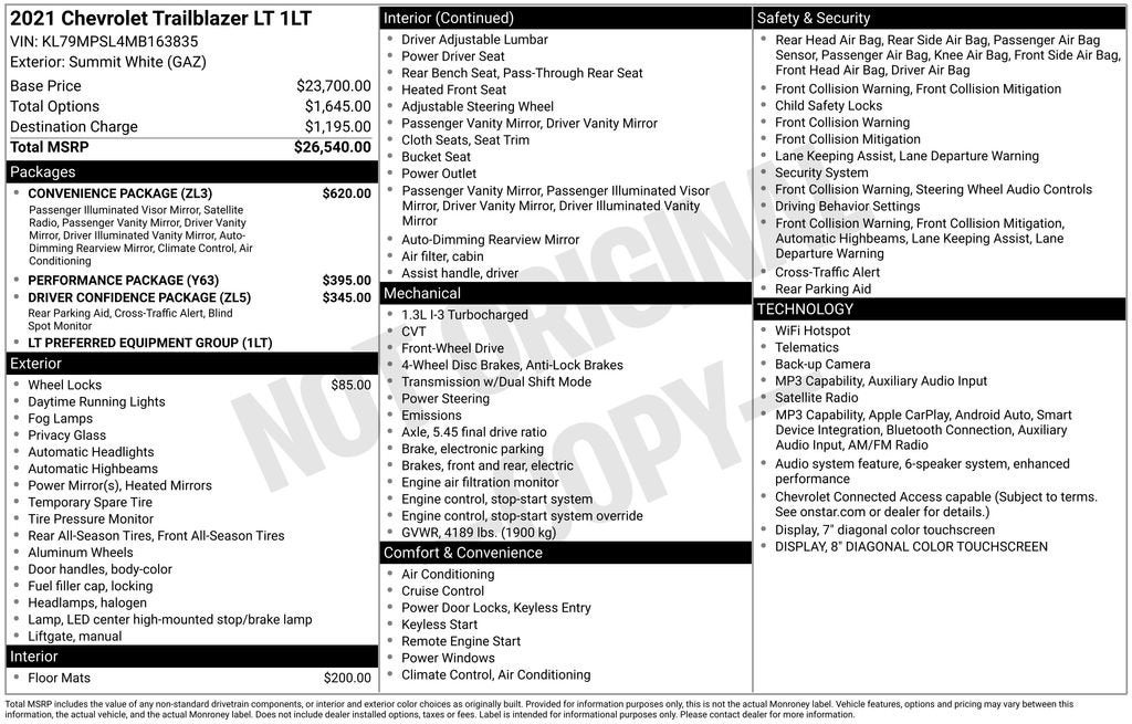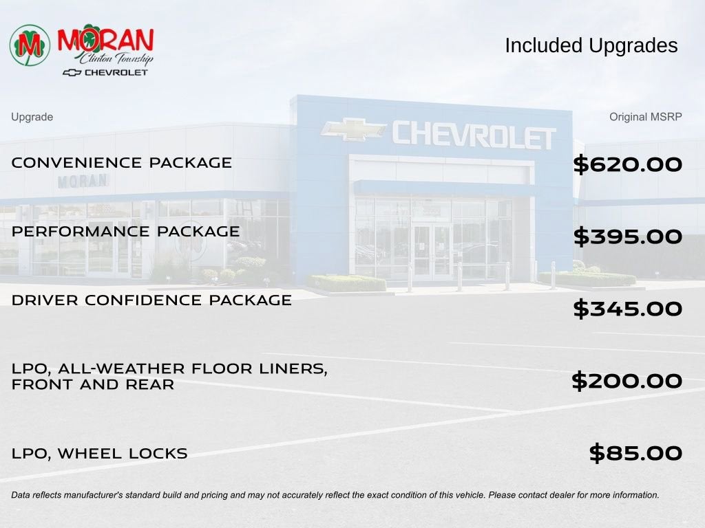 1 Type-A & 1 Type-C USB Charging-Only Ports, 120-Volt Power Outlet, 6-Speaker Audio System Feature, 8 Diagonal Color Touchscreen Display, Convenience Package, Driver & Front Passenger Illuminated Vanity Mirrors, Driver Confidence Package, Inside Rear-View Auto-Dimming Mirror, Lane Change Alert w/Side Blind Zone Alert, Performance Package, Preferred Equipment Group 1LT, Radio: Chevrolet Infotainment 3 System, Rear Cross Traffic Alert, Rear Park Assist, Single-Zone Auto Climate Control Air Conditioning, SiriusXM Radio, Wireless Apple CarPlay/Android Auto.