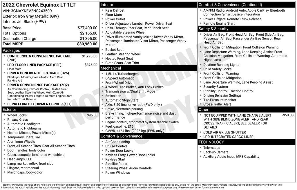 17 Aluminum Wheels, 3-Spoke Leather-Wrapped Steering Wheel, 8-Way Power Driver Seat Adjuster, AM/FM radio: SiriusXM, Auto High-beam Headlights, Confidence & Convenience Package, Driver Confidence II Package, Driver Convenience Package, Dual Zone Automatic Climate Control, Emergency communication system: OnStar and Chevrolet connected services capable, Front & Rear Park Assist, Fully automatic headlights, Heated Driver & Front Passenger Seats, Lane Change Alert w/Side Blind Zone Alert, Preferred Equipment Group 1LT, Premium audio system: Chevrolet Infotainment 3, Premium Cloth Seat Trim, Rear Cross Traffic Alert, Rear Power Liftgate, Remote keyless entry, Remote Start, Security system, Split folding rear seat, Wireless Apple CarPlay/Wireless Android Auto.