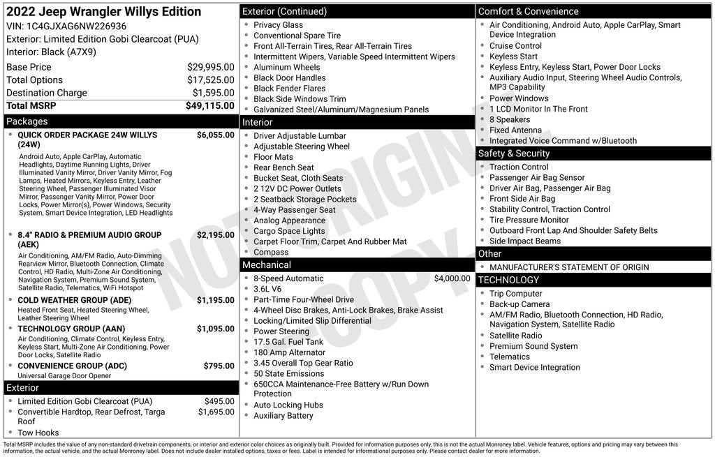 4-Wheel Drive Swing Gate Decal, 8.4 Radio & Premium Audio Group, Air Conditioning w/Auto Temperature Control, Alpine Premium Audio System, Anti-Spin Differential Rear Axle, Auto-Dimming Rear-View Mirror, Automatic Headlamps, Black Grille, Black Trail Rated Badge, Bridgestone Brand Tires, Cold Weather Group, Convenience Group, Deep Tint Sunscreen Windows, Emergency/Assistance Call, Front LED Fog Lamps, GPS Navigation, HD Radio, Heated Front Seats, Heated Steering Wheel, Integrated Voice Command w/Bluetooth®, Leather Wrapped Steering Wheel, LED Headlamp & Fog Lamp Group, LED Premium Reflector Headlamps, Matte Black Jeep Badge, Mold In Color Bumper w/Gloss Black, MOPAR All-Weather Floor Mats, Off-Road Info Pages, Power Heated Mirrors, Quick Order Package 23W Willys, Quick Order Package 24W Willys, Radio: Uconnect 4C Nav w/8.4 Display, SiriusXM Satellite Radio, Sun Visors w/Illuminated Vanity Mirrors, Universal Garage Door Opener, USB Host Flip, Wheels: 17 x 7.5 Moab Black Aluminum, Willys, Willys Hood Decal.