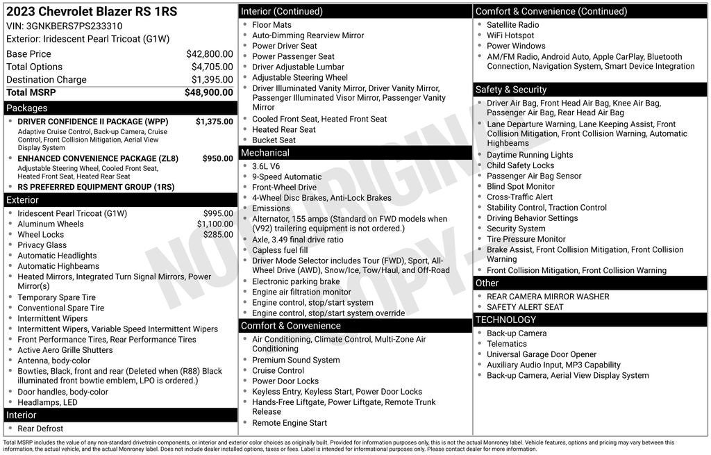 Your Award-Winning Chevrolet Dealer in Clinton Township, MI – Where You Get the Best Price... Period!Certified. Recent Arrival! CARFAX One-Owner. Clean CARFAX.Certification Program Details: After passing our multi-point inspection, every CarBravo-Certified vehicle will receive a 12-month/12,000-mile (whichever comes first) limited bumper-to-bumper warranty - so you can feel confident and protected in your purchase! If the vehicle has bumper-to-bumper coverage remaining under the GM New Vehicle Limited Warranty, then the CarBravo limited bumper-to-bumper warranty coverage will go into effective upon expiration of the original New Vehicle Limited Warranty. If the vehicle's bumper-to-bumper coverage under the GM New Vehicle Limited Warranty has already expired by time or mileage as of the date of the CarBravo transaction, then the CarBravo limited bumper-to-bumper warranty becomes effective on the contract date of the CarBravo sale.Pearl 2023 Chevrolet Blazer RS FWD 3.6L V6 SIDI 9-Speed Automatic with OverdriveAdaptive Cruise Control, Driver Confidence II Package, Enhanced Automatic Emergency Braking, Enhanced Convenience Package, HD Surround Vision, Heated front seats, Heated Rear Outboard Seating Positions, Heated Steering Wheel, Memory Settings For Driver Seat & Exterior Mirrors, Power Liftgate, Power Tilt & Telescoping Steering Column, Preferred Equipment Group 1RS, Rear Camera Mirror, Rear Park Assist w/Audible Warning, Safety Alert Seat, Ventilated Driver & Front Passenger Seats.Moran Chevrolet - (586) 307-6209 - 35500 South Gratiot Ave. Clinton Township, MI 48035.