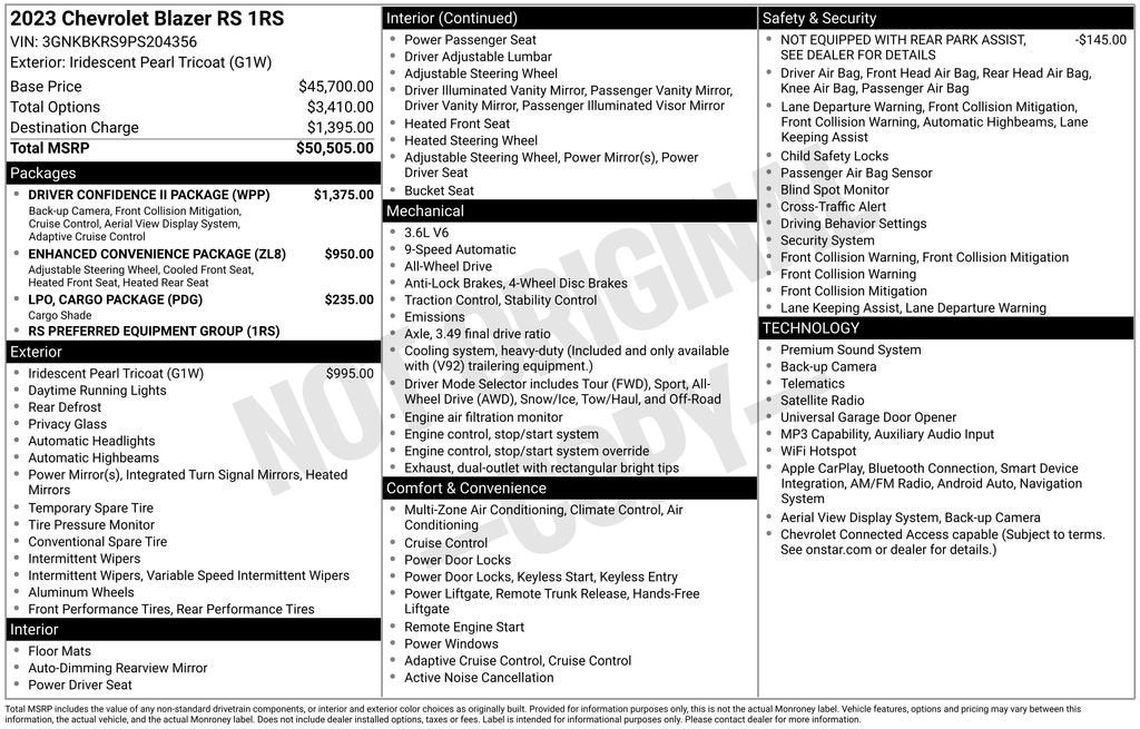 Iridescent Pearl Tricoat 2023 Chevrolet Blazer RS AWD 3.6L V6 SIDI 9-Speed Automatic with Overdrive