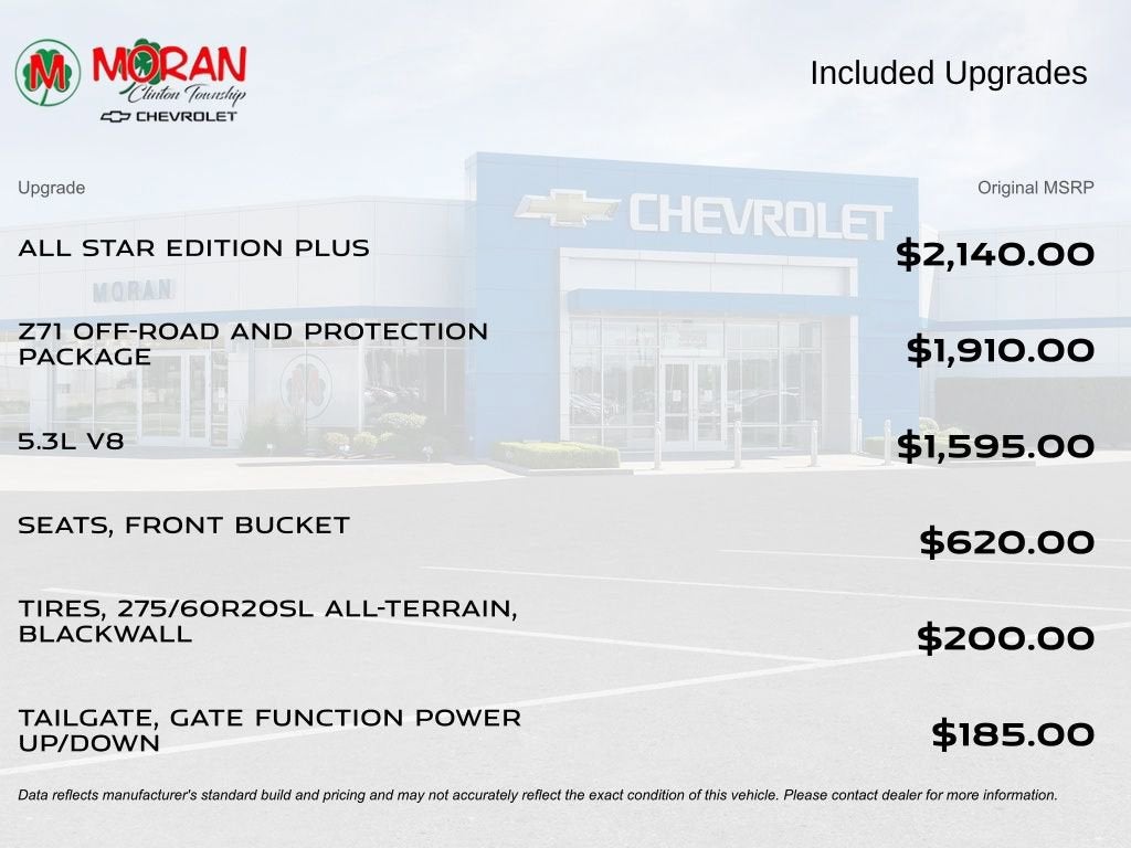 Your Award-Winning Chevrolet Dealer in Clinton Township, MI – Where You Get the Best Price... Period!Certified. Recent Arrival! CARFAX One-Owner. Clean CARFAX.Certification Program Details: After passing our multi-point inspection, every CarBravo-Certified vehicle will receive a 12-month/12,000-mile (whichever comes first) limited bumper-to-bumper warranty - so you can feel confident and protected in your purchase! If the vehicle has bumper-to-bumper coverage remaining under the GM New Vehicle Limited Warranty, then the CarBravo limited bumper-to-bumper warranty coverage will go into effective upon expiration of the original New Vehicle Limited Warranty. If the vehicle's bumper-to-bumper coverage under the GM New Vehicle Limited Warranty has already expired by time or mileage as of the date of the CarBravo transaction, then the CarBravo limited bumper-to-bumper warranty becomes effective on the contract date of the CarBravo sale.Sterling Gray Metallic 2023 Chevrolet Silverado 1500 RST 4WD EcoTec3 5.3L V8 10-Speed Automatic10-Speed Automatic, 4WD, Black Cloth, 10-Way Power Driver Seat w/Lumbar, 12.3 Multicolor Reconfigurable Digital Display, 120-Volt Instrument Panel Power Outlet, 6-Speaker Audio System, All Star Edition Plus, All-Star Edition, All-Weather Floor Liner (LPO) (AAK), Auto-Locking Rear Differential, Bluetooth® For Phone, Chevytec Spray-On Black Bedliner, Color-Keyed Carpeting Floor Covering, Compass, Convenience Package, Convenience Package II, Deep-Tinted Glass, Dual Rear USB Ports (Charge Only), Dual-Zone Automatic Climate Control, Electric Rear-Window Defogger, Electrical Steering Column Lock, Electronic Cruise Control, EZ Lift Power Lock & Release Tailgate, Front Frame-Mounted Black Recovery Hooks, Front LED Fog Lamps, Front Rubberized Vinyl Floor Mats, HD Rear Vision Camera, Heated Driver & Front Outboard Passenger Seats, Heated Power-Adjustable Outside Mirrors, Heated Steering Wheel, High Gloss Black Mirror Caps, Inside Rear-View Mirror w/Tilt, Keyless Open & Start, LED Cargo Area Lighting, OnStar & Chevrolet Connected Services Capable, Power Front Windows w/Driver Express Up/Down, Power Front Windows w/Passenger Express Down, Power Rear Windows w/Express Down, Preferred Equipment Group 1SP, Protection Package, Rear 60/40 Folding Bench Seat (Folds Up), Rear Rubberized-Vinyl Floor Mats, Rear Wheelhouse Liners, Remote Vehicle Starter System, SiriusXM w/360L, Standard Tailgate, Steering Wheel Audio Controls, Theft Deterrent System (Unauthorized Entry), Trailering Package, Wheels: 20 x 9 Painted Aluminum, Wireless Phone Projection, Wrapped Steering Wheel, Z71 Off-Road & Protection Package, Z71 Off-Road Package.Moran Chevrolet - (586) 307-6209 - 35500 South Gratiot Ave. Clinton Township, MI 48035.