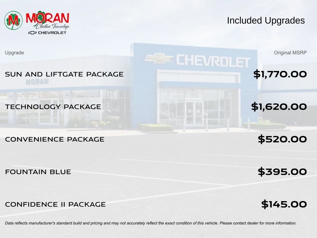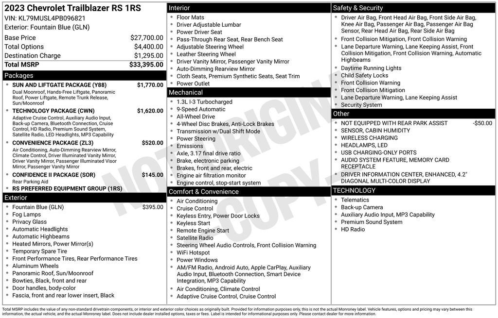 Your Award-Winning Chevrolet Dealer in Clinton Township, MI – Where You Get the Best Price... Period!Certified. Recent Arrival! CARFAX One-Owner. Clean CARFAX. Odometer is 19000 miles below market average!Certification Program Details: After passing our multi-point inspection, every CarBravo-Certified vehicle will receive a 12-month/12,000-mile (whichever comes first) limited bumper-to-bumper warranty - so you can feel confident and protected in your purchase! If the vehicle has bumper-to-bumper coverage remaining under the GM New Vehicle Limited Warranty, then the CarBravo limited bumper-to-bumper warranty coverage will go into effective upon expiration of the original New Vehicle Limited Warranty. If the vehicle's bumper-to-bumper coverage under the GM New Vehicle Limited Warranty has already expired by time or mileage as of the date of the CarBravo transaction, then the CarBravo limited bumper-to-bumper warranty becomes effective on the contract date of the CarBravo sale.Fountain Blue 2023 Chevrolet TrailBlazer RS AWD 1.3L Ecotec Turbo DOHC SIDI w/VVT 9-Speed Automatic1 Type-A & 1 Type-C USB Charging-Only Ports, 120-Volt Power Outlet, 4.2 Diagonal Multi-Color Driver Info Center, 8 Diagonal Color Touchscreen Display, Adaptive Cruise Control, Bose Premium 7-Speaker Audio System Feature, Confidence II Package, Convenience Package, Driver & Front Passenger Illuminated Vanity Mirrors, Dual-Pane Panoramic Power Sunroof, Hands-Free Power Programmable Liftgate, HD Rear Vision Camera, Heated front seats, Heated Steering Wheel, Inside Rear-View Auto-Dimming Mirror, LED Headlamps, Preferred Equipment Group 1RS, Radio: Chevrolet Infotainment 3 Plus System, Rear Park Assist, Single-Zone Auto Climate Control Air Conditioning, Sun & Liftgate Package, Technology Package, Wireless Charging.Moran Chevrolet - (586) 307-6209 - 35500 South Gratiot Ave. Clinton Township, MI 48035.