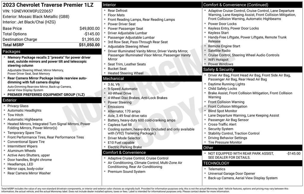 Your Award-Winning Chevrolet Dealer in Clinton Township, MI – Where You Get the Best Price... Period!Certified. Recent Arrival! CARFAX One-Owner. Clean CARFAX.Certification Program Details: After passing our multi-point inspection, every CarBravo-Certified vehicle will receive a 12-month/12,000-mile (whichever comes first) limited bumper-to-bumper warranty - so you can feel confident and protected in your purchase! If the vehicle has bumper-to-bumper coverage remaining under the GM New Vehicle Limited Warranty, then the CarBravo limited bumper-to-bumper warranty coverage will go into effective upon expiration of the original New Vehicle Limited Warranty. If the vehicle's bumper-to-bumper coverage under the GM New Vehicle Limited Warranty has already expired by time or mileage as of the date of the CarBravo transaction, then the CarBravo limited bumper-to-bumper warranty becomes effective on the contract date of the CarBravo sale.Mosaic Black Metallic 2023 Chevrolet Traverse Premier AWD 3.6L V6 SIDI VVT 9-Speed AutomaticAWD, Bose Premium 10-Speaker Audio System Feature, Heated 2nd Row Outboard Position Seats, Heated Driver & Front Passenger Seats, Power Liftgate, Preferred Equipment Group 1LZ, Ventilated Driver & Front Passenger Seats.Moran Chevrolet - (586) 307-6209 - 35500 South Gratiot Ave. Clinton Township, MI 48035.