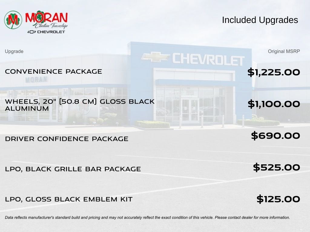 4-Way Manual Front Passenger Seat Adjuster, 8-Way Power Driver Seat Adjuster, Adaptive Cruise Control, AM/FM radio: SiriusXM with 360L, Black Grille Bar LPO), Black Grille Bar Package (LPO), Black Roof-Mounted Side Rails, Convenience Package, Driver Confidence Package, Enhanced Automatic Emergency Braking, Front & Rear Black Bowties, Fully automatic headlights, Heated Driver & Front Passenger Seats, Inside Rear-View Auto-Dimming Mirror, Lane Change Alert w/Side Blind Zone Alert, Preferred Equipment Group 2LT, Rear Cross Traffic Alert, Rear Park Assist w/Audible Warning, Rear Power Programmable Liftgate, Universal Home Remote, Wheels: 20 Gloss Black Aluminum, Wireless Charging.