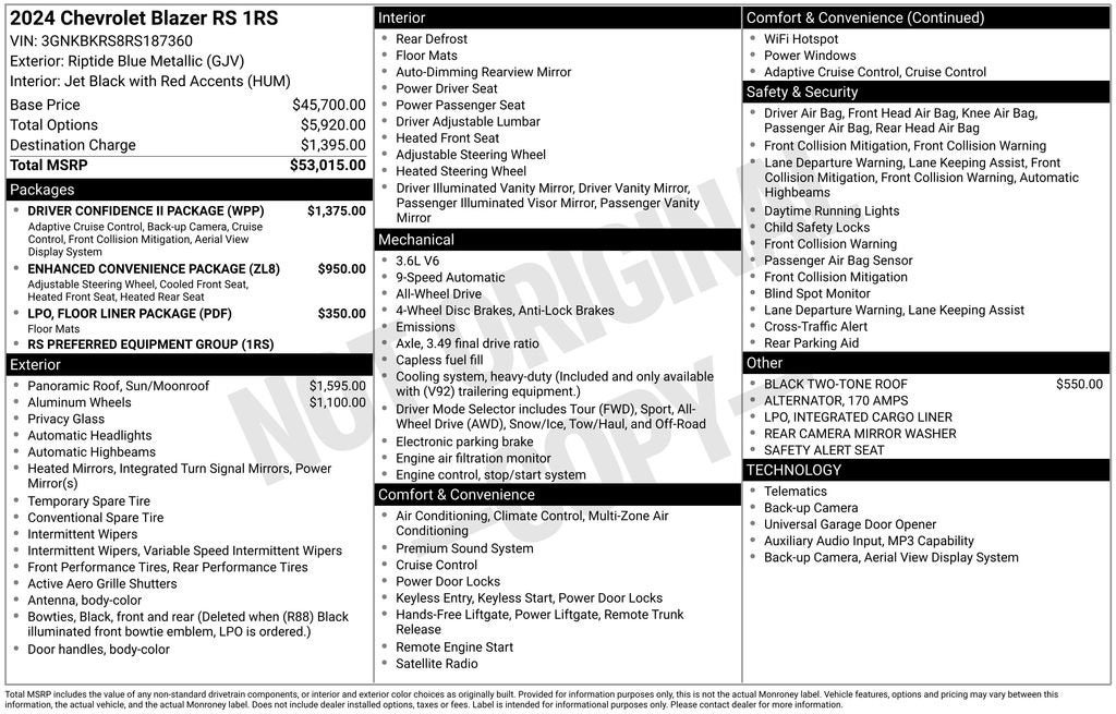 Your Award-Winning Chevrolet Dealer in Clinton Township, MI – Where You Get the Best Price... Period!Certified. Recent Arrival! CARFAX One-Owner. Clean CARFAX. Odometer is 6049 miles below market average!Certification Program Details: After passing our multi-point inspection, every CarBravo-Certified vehicle will receive a 12-month/12,000-mile (whichever comes first) limited bumper-to-bumper warranty - so you can feel confident and protected in your purchase! If the vehicle has bumper-to-bumper coverage remaining under the GM New Vehicle Limited Warranty, then the CarBravo limited bumper-to-bumper warranty coverage will go into effective upon expiration of the original New Vehicle Limited Warranty. If the vehicle's bumper-to-bumper coverage under the GM New Vehicle Limited Warranty has already expired by time or mileage as of the date of the CarBravo transaction, then the CarBravo limited bumper-to-bumper warranty becomes effective on the contract date of the CarBravo sale.Riptide Blue 2024 Chevrolet Blazer RS AWD 3.6L V6 SIDI 9-Speed Automatic with OverdriveAWD, Adaptive Cruise Control, Bose Premium 8-Speaker Audio System Feature, Driver Confidence II Package, Enhanced Automatic Emergency Braking, Enhanced Convenience Package, HD Surround Vision, Heated Rear Outboard Seating Positions, Heated Steering Wheel, Memory Settings For Driver Seat & Exterior Mirrors, Power Panoramic Tilt-Sliding Sunroof, Power Tilt & Telescoping Steering Column, Preferred Equipment Group 1RS, Rear Camera Mirror, Safety Alert Seat, Ventilated Driver & Front Passenger Seats.Moran Chevrolet - (586) 307-6209 - 35500 South Gratiot Ave. Clinton Township, MI 48035.