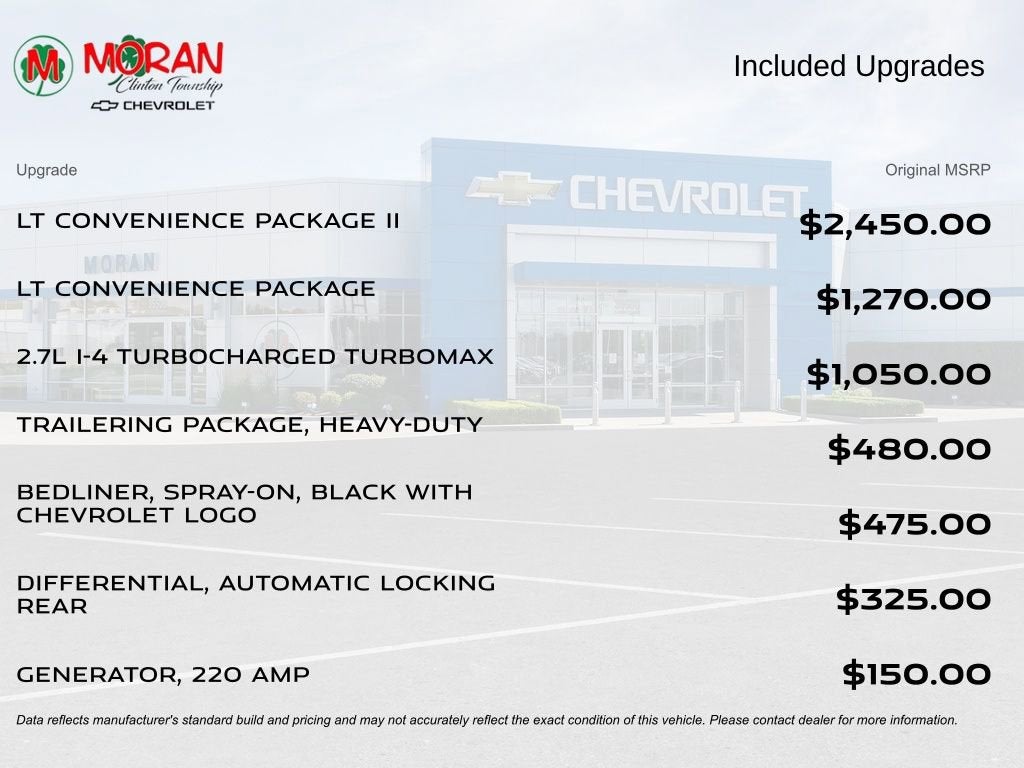 Your Award-Winning Chevrolet Dealer in Clinton Township, MI – Where You Get the Best Price... Period!Certified. Recent Arrival! CARFAX One-Owner. Clean CARFAX. Priced below KBB Fair Purchase Price! Odometer is 3214 miles below market average!Certification Program Details: After passing our multi-point inspection, every CarBravo-Certified vehicle will receive a 12-month/12,000-mile (whichever comes first) limited bumper-to-bumper warranty - so you can feel confident and protected in your purchase! If the vehicle has bumper-to-bumper coverage remaining under the GM New Vehicle Limited Warranty, then the CarBravo limited bumper-to-bumper warranty coverage will go into effective upon expiration of the original New Vehicle Limited Warranty. If the vehicle's bumper-to-bumper coverage under the GM New Vehicle Limited Warranty has already expired by time or mileage as of the date of the CarBravo transaction, then the CarBravo limited bumper-to-bumper warranty becomes effective on the contract date of the CarBravo sale.Harvest Bronze Metallic 2024 Chevrolet Colorado LT 4WD 2.7L I4 Turbocharged DOHC 16V LEV3-ULEV50 237hp 8-Speed Automatic4WD, 8-Way Power Driver Seat Adjuster, Chevy Safety Assist, Driver & Front Passenger Illuminated Visors, Dual-Zone Automatic Air Conditioning, Electronic Automatic Cruise Control, EZ-Lift & Lower Tailgate, Front LED Fog Lamps, Heated Driver & Front Passenger Seats, Inside Rear-View Auto-Dimming Mirror, LT Convenience Package, LT Convenience Package II, Manual Rear-Sliding Window, Power Driver Lumbar Control Seat Adjuster, Preferred Equipment Group 4LT, Rear-Window Electric Defogger, Remote Vehicle Starter System, StowFlex Tailgate Storage Compartment, Tailgate Keyed Cylinder Lock, Tilt & Telescoping Steering Column, Wireless Charging.Moran Chevrolet - (586) 307-6209 - 35500 South Gratiot Ave. Clinton Township, MI 48035.