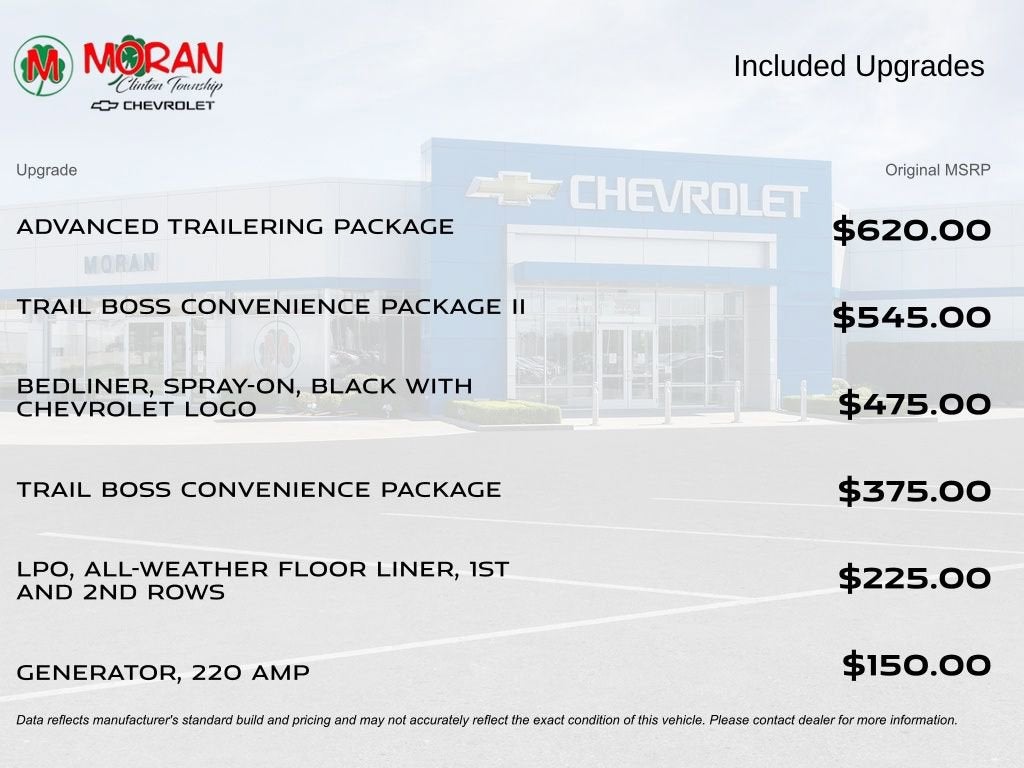 4WD, 8-Way Power Driver Seat Adjuster, Advanced Trailering Package, Chevy Safety Assist, Electronic Automatic Cruise Control, EZ-Lift & Lower Tailgate, Heavy-Duty Trailering Package, Integrated Trailer Brake Controller, Manual Rear-Sliding Window, Power Driver Lumbar Control Seat Adjuster, Preferred Equipment Group 0TR, Rear-Window Electric Defogger, StowFlex Tailgate Storage Compartment, Tailgate Keyed Cylinder Lock, Trail Boss Convenience Package, Trail Boss Convenience Package II, Trailering App.