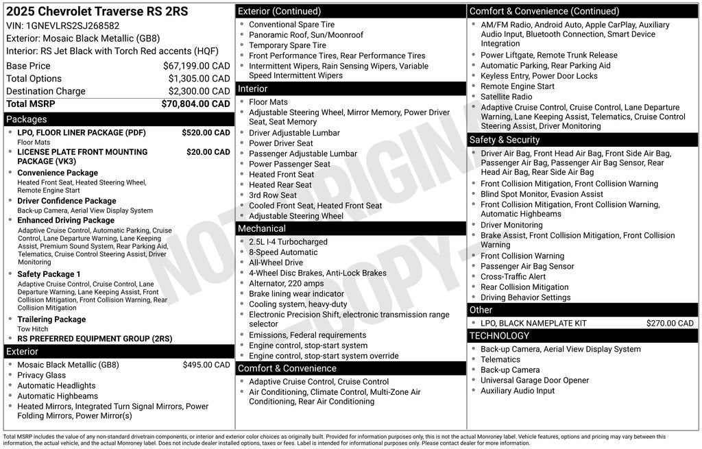 Your Award-Winning Chevrolet Dealer in Clinton Township, MI – Where You Get the Best Price... Period!Certified. Recent Arrival! CARFAX One-Owner. Clean CARFAX. Odometer is 2762 miles below market average!Certification Program Details: After passing our multi-point inspection, every CarBravo-Certified vehicle will receive a 12-month/12,000-mile (whichever comes first) limited bumper-to-bumper warranty - so you can feel confident and protected in your purchase! If the vehicle has bumper-to-bumper coverage remaining under the GM New Vehicle Limited Warranty, then the CarBravo limited bumper-to-bumper warranty coverage will go into effective upon expiration of the original New Vehicle Limited Warranty. If the vehicle's bumper-to-bumper coverage under the GM New Vehicle Limited Warranty has already expired by time or mileage as of the date of the CarBravo transaction, then the CarBravo limited bumper-to-bumper warranty becomes effective on the contract date of the CarBravo sale.Black 2025 Chevrolet Traverse RS AWD 2.5L DOHC 8-Speed AutomaticAWD, Heated front seats, Heated rear seats, Perforated Leather-Appointed Seat Trim, Power Dual Glass Panoramic Sliding Sunroof, Power Liftgate, Preferred Equipment Group 2RS, Ventilated front seats.Moran Chevrolet - (586) 307-6209 - 35500 South Gratiot Ave. Clinton Township, MI 48035.