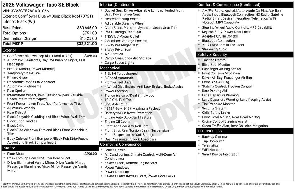 Your Premier Certified Pre-Owned Dealer in Chesterfield, MI – Where You Get the Best Price... PERIOD!Deep Black 2025 Volkswagen Taos 1.5T SE Black FWD 1.5L I4 Turbocharged DOHC 16V LEV3-SULEV30 174hp 8-Speed Automatic with TiptronicMoran Certified Pre-Owned 586-434-0920 - 29425 23 Mile Rd. Chesterfield MI, 48047.